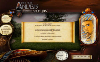HET HUIS ANUBIS: Het Geheim van Osiris![]() Uitgever: Studio 100 / 2008 Ontwerper: The Pharmacy Platform: PC, Nintendo DS. Systeemeisen: --- Windows 2000/XP/Vista - Pentium 3 1GHz - 512 MB RAM Categorie: Puzzelavontuur naar TV-serie, mysterie, tijdreizen, getekend realisme en 2D stripbeelden, 1ste persoon, point & click, NL gesproken. Extra info: Ook uitgebracht voor de Nintendo DS. Enkele puzzels zijn speciaal hiervoor aangepast. Walkthrough: klik hier voor Marjo's Nederlandstalige walkthrough. Beschrijving en review: Het Huis Anubis is een zeer populaire Nederlandse jeugdserie op TV, waarin een aantal jongeren op zoek gaan naar een schat. Dit is natuurlijk een ideaal gegeven voor een adventurespel, moeten de makers gedacht hebben. Als het spel begint, heb je huisarrest. Je zit op je kamer als er een steen door het raam vliegt. Er zit een briefje met een telefoonnummer om de steen gewikkeld. Iemand heeft je hulp nodig! Je eerste taak is dan ook om uit je kamer te ontsnappen en een telefoon te zoeken. Je krijgt Nienke aan de lijn (of Fabian, als je voor hem als hulplijn hebt gekozen). Je krijgt nu een dialoogschermpje te zien, waarop jij de vraag kunt aankruisen die je wilt stellen. Nienke zegt dat je een oude archeoloog moet zoeken in een verlaten herberg. Dat klinkt spannend! Dat wil je natuurlijk wel, maar dat is nog niet zo eenvoudig. Je zult overal spulletjes moeten zoeken, die je bij deze taak kunnen helpen en als je dan ook nog geesten ontmoet die jouw hulp nodig hebben, dan zit je midden in een avontuur. Je reist zelfs naar het Egypte van 1920, op zoek naar het geheim van Osiris.