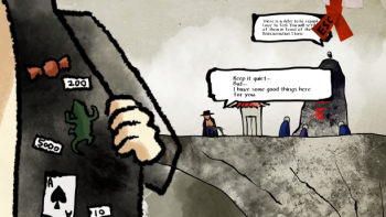 ![]() De prachtige achtergronden zijn handgetekend in vloeiende lijnen. Het lijkt alsof op een stuk rijstpapier, met inkt gekleurde vlakken later voorzien werden van zwarte lijnen. Kunstwerkjes, die niet slecht zouden staan, ingelijst aan je muur. Kleine animaties in achtergrond zoals een vogel of wiebelende hoofden en druppend bloed geven wat levendigheid. Ook de hond is schitterend minimalistisch weergegeven in vloeiende lijnen. En hij beweegt net zo vloeiend over het schem. De muziek is mede sfeerbepalend. Fluit- en drum zorgen voor een typisch Aziatisch geluid. Hetzelfde deuntje klinkt door het hele spel en dat kan soms wat storen, maar over het algemeen is het prettig spelen met muziek die bij de beelden past. Er zijn geen gesproken stemmen in het spel.