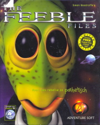 THE FEEBLE FILES![]() Uitgever: Adventure Soft Publishing / 1997 Ontwerper: Adventure Soft Publishing Platform: Amiga, PC, Mac. Systeemeisen: --- Windows 95 - Pentium processor - 16 MB RAM - 4x CD-ROM drive - 25 MB opslagruimte. Categorie: Science fiction, zwarte humor, samenzwering, rebellie, getekende cartoonbeelden, 3de persoon, point & click. Beschrijving: Je speelt een alien genaamd Feeble. Hij leeft in een wereld die wordt bestuurd door de OmniBrain, die tot doel heeft iedereen gelukkig en succesvol te houden. Als zodanig worden ongelukkige mensen vermoord en bestaan er meer dan een miljoen wetten. Feeble werkt voor de graancirkelafdeling van het Ministerie van Galactische Onzekerheid. Dit houdt in dat er graancirkels worden gemaakt op minder geavanceerde planeten dan die van Feeble, als een manier om paniek op die planeten te veroorzaken en hun intellectuele ontwikkeling te onderdrukken. Op weg naar huis na weer een succesvolle dag met het maken van graancirkels om de eenvoudige mensen van de achtergebleven planeet "Aarde" te amuseren en te vermaken, krijgt onze held Feeble een klein ongelukje in zijn ruimteschip, wat resulteert in de totale vernietiging van een nogal belangrijk onderzoekslaboratorium van de onderneming. Die wordt gerund door zijn baas, in feite. Alsof dat nog niet erg genoeg was, terwijl hij zijn verdriet verdrinkt in de lokale Space Bar, slaagt hij er op de een of andere manier in om betrokken te raken bij de schimmige Freedom Fighters, een team van rebellen dat het tirannieke regime van de OmniBrain, Ruler of Everything, omver wil werpen.