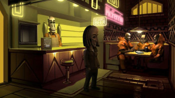 ![]() De grafische beelden in HD kwaliteit zijn zonder meer fantastisch noemen voor een indiegame en een hele verbetering ten opzichte van de oorspronkelijke versie van het spel, die Skygoblin als gratis retroversie aanbiedt. Ook op een groot 23 inch beeldscherm is het nergens pixelig. De achtergronden zijn met veel gevoel voor detail geschilderd en in prettige, bijna reële kleuren gehouden. De animaties verlopen vloeiend en verlevendigen de achtergronden. Of het nu stromend water met een dobber is, of een bootsman die aan zijn pijp lurkt, of knipperende stadslichten, alles ziet er professioneel perfect uit en draagt bij tot een natuurlijk sfeer. De tussenscènes zijn lang en zijn vloeiend als een tekenfilm. Bwana is een opmerkelijk en unieke hoofdrolspeler in een adventurespel. Zijn gezicht is geïnspireerd is op een Afrikaans masker, hij heeft een rastakapsel en praat als een stereotype inwoner van Jamaica. En dat terwijl het team van Skygoblin uit Zweden komt. Het is een zeer welkome en verfrissende afwisseling in een adventurespel! Maar ook de medebewoners met wie Bwana contact heeft, zijn allemaal met veel liefde vormgegeven en ze hebben een duidelijk eigen karakter dat op een grappige manier bij hun uiterlijk past.