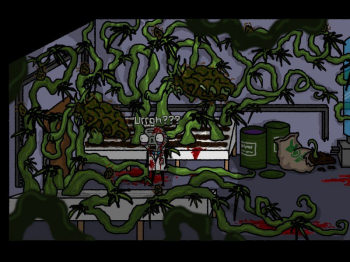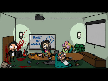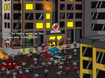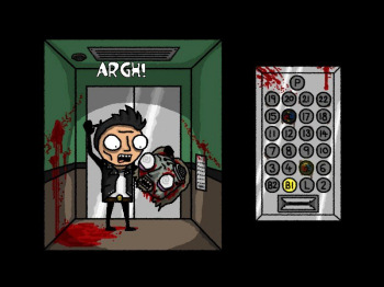 METAL DEAD![]() Uitgever: walkthruwalls.com / 2011 Ontwerper: Liam O'Sullivan, Robert Wriedt, Walk Thru Walls Studios Platform: PC Systeemeisen: --- Windows XP/Vista/7/8 - CPU met directX 9.0 - 512 MB RAM - Direct Draw en Pixelshader 1.4 compatible grafische kaart - 1,4 Gb opslagruimte - geluidskaart. Categorie: Horror, humor, zombies, veel bloed, cartoon, heavy metal invloed, getekende 2D en 2.5D beelden, 3de persoon, point & click. Walkthrough: klik hier voor Marjo's Nederlandstalige walkthrough. Beschrijving en review: In het debuut van dit jonge, onafhankelijke Australische spelmakersteam, volgen we de avonturen van twee metalhead vrienden die midden in een zombie acopolypse terechtkomen. Nadat ze met hun auto een ongeluk krijgen gaan ze een medisch onderzoeks laboratorium in om te onderzoeken waarom de zombies zich juist hier verzamelen. Vervolgens ontmoeten ze vreemde en totaal gestoorde, nog levende mensen en hebben ze de grootste moeite om al problemen oplossend, een weg naar buiten te vinden. Het verhaal is voor een adventure origineel te noemen en wordt goed uitgewerkt. In de dialogen en animaties wordt met een knipoog verwezen naar de stereotypen in bloedige horrorfilms en naar metal liefhebbers. Het hele spel speelt zich af in een flatgebouw. Met en met werk je je weg vanaf de kelder tot aan het dak. Daarbij is het spelverloop nogal lineair gehouden. Pas als je bepaalde opdrachten uitgevoerd hebt, krijg je een liftkaart, die je naar een volgende verdieping brengt. Als je eenmaal ergens bent geweest, kun je wel altijd terug. De puzzels zijn, op één na, allemaal gebaseerd op je inventaris. Ze zijn logisch en voor het merendeel niet te moeilijk. Ook kun je hulp vragen aan je ondode vriend. In het commentaar op de dingen die je bekijkt, zit eveneens vaak een hint verborgen. Zo vind je bijvoorbeeld een schoonmaakmiddel, waarvan Malcolm zegt dat het verboden is, omdat iemand er een bom van maakte. Tja, dan weet je wat je te doen staat. ![]() ![]() De handgemaakte, in 2D getekende grafische beelden zou je misschien het beste kunnen omschrijven met "apart". Het eerste dat je opvalt, zijn de rode "bloed"vlekken en de bloederige lichaamsdelen die je werkelijk overal in de achtergrondbeelden ziet. Het maskeert in ieder geval de sobere vormgeving. De originele tekenstijl van de karakters wordt consequent doorgevoerd. Afgezien van het bloed, wijken de zombies eigenlijk niet eens zoveel af van de "gewone" mensen, waaruit ze "ontstaan" zijn: dezelfde grote ogen, hongerig bij de zombies en verschrikt bij de mensen. Dezelfde vierkante vorm met zwarte stokarmen en -benen. Het speelbare karakter loopt vloeiend, zij het niet in perspectief. Alle anderen zijn min of meer statisch. Er is wel aandacht geschonken aan kleine bewegende details, zoals opbollende luidsprekers, draaiende oogjes, druppend bloed en knipperende automaten, die het geheel wat verlevendigen. De bediening gaat intuïtief. Je kunt door te klikken, kijken, praten of actie ondernemen. Er zitten nergens naamtags aan, maar als je met de cursor over een voorwerp of persoon gaat waarmee interactie mogelijk is, verandert hij duidelijk van vorm. De voorwerpen in je inventaris zijn duidelijk herkenbaar getekend. Mocht je desondanks niet weten wat het voorstelt, kun je ook daar ernaar kijken en commentaar erop krijgen. Dialogen verschijnen met diverse, herhaalbare keuzemogelijken onder in het speelscherm, in een goed leesbaar lettertype. ![]() ![]() Er zijn geen gesproken stemmen in het spel. De sterkte van muziek en achtergrondgeluiden zijn apart regelbaar. De muziek is goed gekozen. Ondanks het hoge "metal" gehalte is het nergens overdonderend en onderstreept hij uitstekend de sfeer van het spel. Er is ook ruim voldoende variatie, vrijwel elke ruimte heeft zijn eigen leidmotief. Geluidseffecten zijn niet overdadig aanwezig, je hoort geen vogeltjes of wind of schreeuwende zombies of andere achtergrondgeluiden. Maar wat je moet horen, zoals het geluid van een liftdeur, is er wel. En de spelmakers hebben hun best gedaan te letten op bijzondere details. Zo hoor je bijvoorbeeld een ritssluiting als je de inventaris-rugzak opent! ![]() ![]() Zoals de makers op hun site aangeven, hebben ze een spel gemaakt, dat ze zelf erg graag zouden willen spelen. Een spel met veel bloed, zombies en een flinke dosis humor, onderstreept met "metal" muziek. Het werd een spel dat wellicht alleen aantrekkelijk is voor een bepaald jong publiek, dat een weekendje lekker bezig wil zijn met een origineel adventurespel. Grotere plaatjes bekijken? Ga naar de screenshots. |