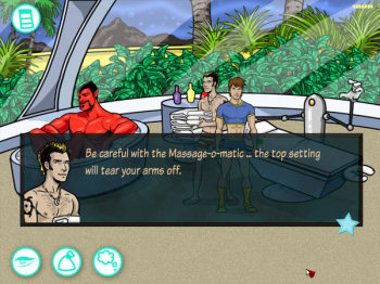 ![]() In dit spel geen Lara Croft in sexy outfit, maar een knappe jongeman, gekleed in een belachelijk uniform, bestaande uit korte broek en te kort t-shirt. Een standaard outfit die hij dus elke keer kwijtraakt als hij via een transporter reist. Hij duikt dan op in zijn ondergoed en mag eerst een reserve-uniform zoeken. Verder zie je natuurlijk stoere mannen in rubberkleding, een drag queen en lieve jongens die verlegen kijken. Heel stereotyp. De sexueel getinte opmerkingen die hier en daar gebezigd worden zijn niet aanstootgevend en zeker bedoeld als nonchalant grapje. Al is de pratende lift een beetje op het randje van wat nog kan als hij laat blijken dat hij het prettig vindt dat Tycho in hem stapt. Wie denkt een sexspel te kunnen spelen, kont dus bedrogen uit. Het is een vriendelijke cartoon waarin toevallig mannelijke figuurtjes rondlopen die op mannen vallen, meer niet. Verander het uiterlijk van een paar van die figuurtjes en niemand zou zich er druk over maken.