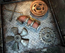 Aan de linkerkant van de hal hangt een verroest legervoertuig op een gestel. Het rechter achterwiel komt qua vorm overeen met een van de vormen op het weegplateau. Met de waterpomptang is het niet los te krijgen.