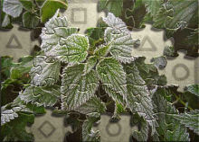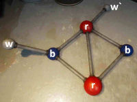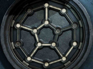 De beide doorzichtige vellen laten een molecuulmodel zien dat doet denken aan de puzzel van de putdeksel. Breng dit model over op het puzzelslot van de putdeksel en je kunt via een ladder afdalen naar een Kelderruimte.