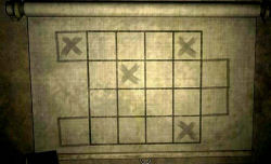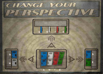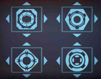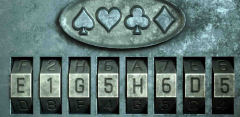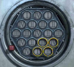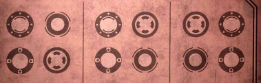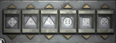 Het puzzelslot van de linker kast heeft een schermpje waarop vier symbolen staan. Die kun je veranderen met de pijltjes eromheen. De pijltjes links en rechts verwisselen de omranding van de symbolen die je op de tank aantreft. De pijltjes boven en onder verwisselen de binnenkant van de symbolen zoals op de wandplaat.