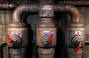 Achterin de kamer zie je een buizenstelsel met een rode afsluiter die stevig is vastgeschroefd.
