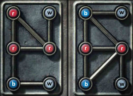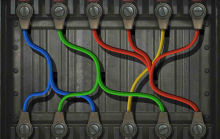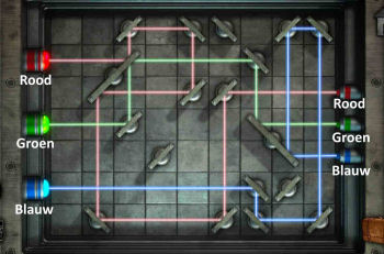 Het doel is om een doorgaande gesloten verbinding te maken tussen een lampje links en twee lampjes rechts.