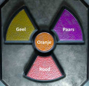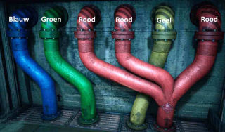 Druk op ruit, brandbaar en rood, waardoor de eerder ingedrukte knoppen vanzelf terugspringen. In de rechter gang komt nu geen damp meer uit de rode buis.