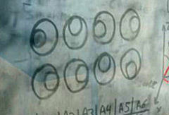 Op de tank en op de wandplaat met de 12 symbolen is ook zo'n baan geschetst. Dat betekent dat je je voor het puzzelslot van de linker kast moet richten op de vier meest linkse symbolen.