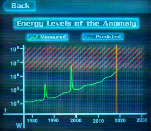 Druk vervolgens weer op 'back' gevolgd door 'Energieniveaus'. Er verschijnt een grafiek met langs de horizontale as de tijdlijn in jaren en langs de verticale as de Energieniveaus van de Anomalie op een logaritmische schaal (van 104 tot 105 is een factor 10 en van 105 tot 106 weer een factor 10).