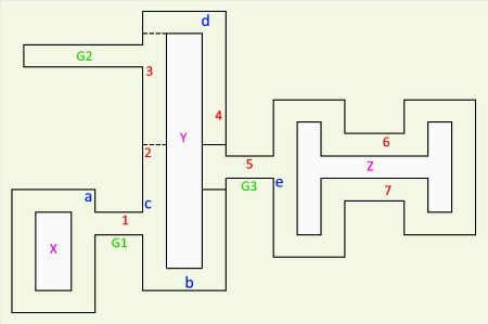 Het stelsel bestaat uit enkele onderling verbonden ruimten voorzien van afwateringskanalen.![]() NB: Het is raadzaam je spel hier op te slaan. Je begint in ruimte X onder de put. Steek schuin over en ontsteek de lantaarn. Bij (a) zit een afsluiter. Ga via de gang (G1) naar ruimte Y en merk op dat in de gang een stuk pijp uit de muur steekt bij 1. De lange ruimte Y heeft afsluiters bij (b), (c) en (d) en pijpen bij 2, 3 en 4. Ga de helling op langs 2 en 3 dan kun je linksaf slaan een lange gang (G2) in die naar de uitgang leidt. De deur is echter gesloten. Keer terug naar ruimte Y en steek schuin over voorbij pijp 4 naar de betonnen uitbouw. Maak daar licht en merk de twee bevestigingspunten op. Loop nu naar het achtereind bij afsluiter (d) en draai naar links. In het water ligt een lijk. Volgens de brief betreft het meester Cornelius: Alles is verloren. Ik schrijf dit op voor wie mij ook maar vindt. Gehenna en ik raakten gescheiden van elkaar toen de aanval begon. Zij kreeg het voor elkaar om hetvolgende gedeelte van het rioolstelsel te bereiken maar de ladder zakte weg en zonk in het slijk. Zij ging haar achterna en ik zweer dat ik het hoorde lachen. Omdat Lady gehenna de sleutels had moet ik wachten totdat mijn lichaam het begeeft van de honger of ...tot zij terugkomt. We hadden het nooit moeten oproepen. Ik hoort hier niet. -Meester Cornelius Op het lijk vind je een compact cilindrisch voorwerp. In de inventaris zie je dat het een uittrekbare wandelstok is. Bekijk de stok van nabij en draai hem zo dat je de kop kunt aanraken (handje). Als het handvat is uitgetrokken kun je nogmaals met het handje de stok verlengen. Je krijgt een bericht te zien dat de wandelstok volledig is uitgetrokken en stevig op zijn plaats is vergrendeld. Keer terug naar ruimte X en positioneer jezelf onder de put. Klik op de ladder en sleep daarna de wandelstok ernaartoe. Met behulp van de stok haal je de ladder binnen je bereik. Bevestig de ladder in ruimte Y aan de bevestigingspunten en je kunt naar boven. De doorgang in de tweede dwarsgang (G3) wordt evenwel verhinderd door hete stoom die uit de pijp bij 5 lekt. Loop naar afsluiter (d) en draai daaraan. Het gevolg is dat er geen stoom meer uit pijp 2 komt, maar daarentegen wel uit pijp 1. Klim de trap op naar dwarsgang (G3) en loop door naar ruimte Z. Meteen links om de hoek is een lantaarn en rechts om de hoek afsluiter (e). Beneden je zie je zowel links als rechts stoom uit pijpen komen. Draai aan afsluiter (e) met als gevolg dat de linker pijp 6 ophoudt met stomen. Ga naar die pijp 6 toe, maak de lantaarn aan en begeef je dan naar het verste punt. Als je daar naar links draait ontdek je weer een lijk en een sleutel. Dit moet Gehenna zijn die de sleutels bij zich droeg. Keer terug naar ruimte Y en bemerk dat behalve bij 1 ook bij 3 en 4 stoom ontsnapt. De stoom bij 3 verhindert je de uitgang te bereiken. Voer nu achter elkaar de volgende acties uit, waarbij de uiterst linker kolom voorschrijft aan welke afsluiter je moet draaien en de andere kolommen laten zien welke pijpen daarna stoom afgeven (NB: zorg dat je steeds maar één keer aan een afsluiter draait):