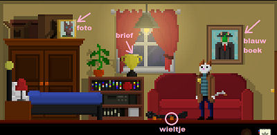Verder zie je een tabblad 'Help'. Daar kun je hints krijgen door Waffles moeder te bellen.