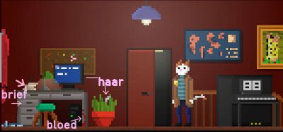 Praat verder over het parfum en klik dan op de liefdesbrief in de inventaris. Kies de nieuwe vraag in het notitieboek (Fluffy admirer) en daarna weer op de aanwijzing over het parfum.