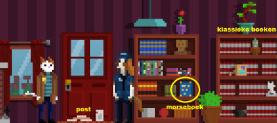 Zet het boek in de inventaris tussen de andere blauwe boeken. Waffles hoort een klik, maar er gebeurt niets.