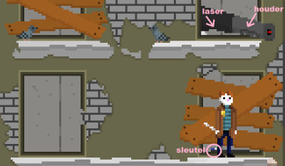 Het apparaatje (jamming device) is klaar en komt in de inventaris terecht. Pixel geeft er een makkelijke uitleg bij. Je hoeft alleen in de buurt te zijn van de laser en dan de rode knop in drukken. Als het apparaat niet werkt, moet je kortsluiting veroorzaken. Daarvoor heb je een schroevendraaier nodig. Pixel heeft de zijne uitgeleend aan Patches.