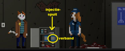 Pak er de injectiespuit (syringe) uit weg en het verband (bandages).