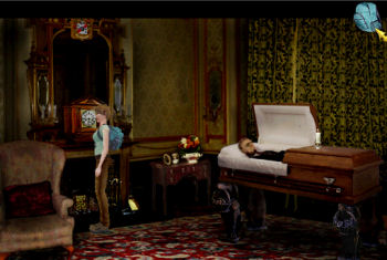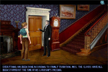 ![]() Plaatjes en animatie Er zijn in dit spel heel veel locaties te bezoeken en elk heeft zijn eigen passende sfeer. Hoewel de achtergronden collages zijn, lijken ze fotografisch realistisch. De verhoudingen en de kleuren kloppen en de details zijn niet te overdadig, maar net genoeg om alles "echt" te doen lijken, ook in de close-ups. Buiten zie je heldere natuurgetrouwe omgevingen met wandelpaadjes, struiken en rotsen of straten met huizen. Binnen is het nergens te donker en zijn mooie details te bewonderen. De kamer in Black Dog Manor is prachtig met zijn antieke spiegel, ouderwetse fauteuil en bloemstukje met fotolijstjes op een tafeltje. Er staat ook een flakkerend kaarsje op de lijkkist om de verder statische achtergrond te verlevendigen. De parketvloer in de hal ziet er levensecht uit zonder fotografisch te zijn. De club van de adventurers ziet er ook al zo "gezellig" uit en er is een gloeiend haardvuur te zien dat licht beweegt. Maar boomtoppen bewegen niet in de duidelijk hoorbare wind. De geanimeerde personen lijken hier en daar opgeplakt en lopen wat houterig met bijna gestrekte benen zonder hun schouders te bewegen. De mimiek verandert niet.