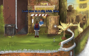 ![]() De puzzels zijn voornamelijk gebaseerd op je inventaris en passen heel logisch in het verhaal. Lever bijvoorbeeld een pakje af voor een fooi, die je dan weer ergens anders nodig hebt. Maar ook mensen en robots misleiden hoort erbij als je verder wilt. Verder zijn er nog minigames die eveneens prima geïntegreerd zijn in het verhaal. Zo speel je een ouderwets spelletje bommen ontwijken op een machine in een arcadehal. Je wilt immers tickets winnen. Al met al zijn de 'problemen' die je ontmoet niet echt moeilijk op te lossen als je het verhaal volgt en een beetje creatief denkt. Houd er wel rekening mee dat je in dit spel dood kunt gaan. In dat geval kun je vanaf het laatste checkpoint nog eens een poging wagen.