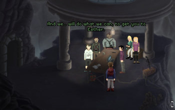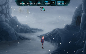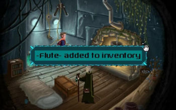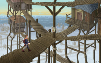 ![]() Grafisch is het spel helemaal in retrostijl gehouden. Wat niet wil zeggen dat het onspeelbaar pixelig is. Integendeel zelfs. De vele achtergronden zijn in een goede resolutie en met veel aandacht voor detail vormgegeven. Kleine animaties zoals een houtvuurtje verlevendigen heel natuurlijk het geheel. De vloeiend geanimeerde karakters zijn eenvoudig van opbouw en wat minder gedetailleerd. Dus bijvoorbeeld wel schoenen, maar geen veters of slijtplekken. Toch zie je ook bij hen beweging van hoofd en mond als ze praten. En als Alum iets opraapt beweegt hij zijn armen. De voorwerpen die hij verzamelt, gaan naar een inventaris, die verscholen zit in een menubalk. Hij komt tevoorschijn door er met je cursor overheen te gaan. Kijken of actie zit onder je muisknop en scrollen door de voorwerpen onder het wieltje. het is allemaal heel simpel en effectief.