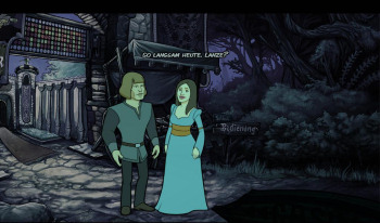 ![]() De middeleeuwse sfeer is prima neergezet in de mooie, gedetailleerde achtergronden, die opgefleurd worden met kleine animaties. Het geheel is in 2D en dat past er perfect bij. De karakters zijn iets minder gedetailleerd, maar grappig is wel dat ook in de cartoonfiguren, de filmacteurs duidelijk herkenbaar zijn. De animaties in de tussenscènes en van de lopende karakters zijn niet erg vloeiend en dat is jammer. Het had beslist beter gekund, waardoor ook die mooie achtergronden beter tot hun recht waren gekomen. In het spel zijn voor de hoofdrolspelers de stemmen van de filmacteurs gebruikt. Nadeel daarvan is, dat deze acteurs geen ervaring hebben met het synchroon inspreken van tekenfilmfiguren. Vooral bij ridder Lanze is dit storend. Vooral omdat de tekst veelal vlak en zonder enthousiasme of inlevingsvermogen wordt uitgesproken. Gelukkig doet ridder Erdal het beter en zet hij zijn karakter overtuigend neer. De dialogen zijn op zich wel grappig en het is dan ook jammer dat die niet beter tot zijn recht komen. De muziek is eveneens uit de film afkomstig en er klinken dan ook aardige deuntjes die nergens teveel op de voorgrond treden.