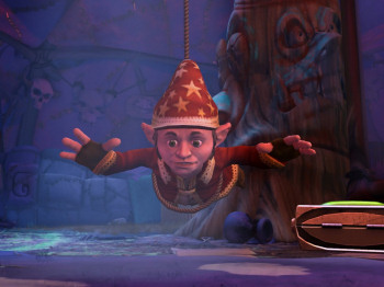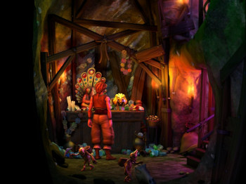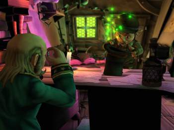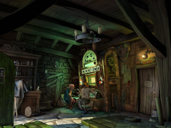![]() Er zijn vier verschillende karakters om mee te spelen: Wilbur de gnome, Ivo de elf, Nathan de mens en een harig beestje. Er zijn hoofdstukken waarin ze alleen werken, maar ook delen waarin ze samen in beeld zijn. Via kleine portretjes in de bovenhoek van je beeld, kun je dan zo nodig op elke gewenst ogenblik naar het andere karakter overschakelen. Je kunt iets bekijken en je kunt een actie uitvoeren zoals praten of pakken/geven. Door op de tab-toets te duwen, krijg je alle actieve punten in beeld te zien, zodat je nergens in de rijk getailleerde omgeving naar voorwerpen hoeft te zoeken. Tenzij je dit zelf wilt, natuurlijk. Er zijn hotspots die je vaker moet aanklikken om alle informatie te krijgen. Dit is geen probleem, want als je de plek niet meer nodig hebt, is hij verder ook niet meer aanklikbaar, dus werkt het in feite een extra hintfunctie.