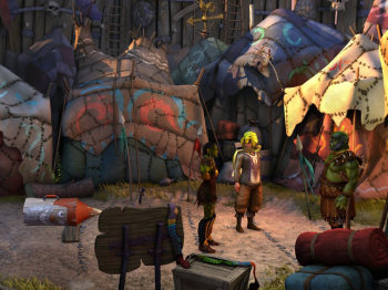 ![]() Het spel is geheel in hoge resolutie en geschikt voor breedbeeld. De halfstatische achtergronden zijn een combinatie van 3D modellen en handgetekende beelden in een perfecte belichtingmet natuurlijke schaduwen. Ze zitten vol details in de juiste kleuren. Dat alleen al is een genot om naar te kijken elke keer als je in een nieuwe omgeving komt. Het maakt niet uit of je daarbij op ooghoogte of in vogelperspectief rondloopt, in besneeuwde bergen, een mensen stad, een roodverlichte trollensmederij of de blauwgroen verlichte maag van een monster. Alles is even realistischen sfeervol. Voeg daar nog karakters bij met bewegende gezichtsuitdrukkingen en expressieve bewegingen en je hebt het gevoel in een fantasierijke poppenanimatiefilm zoals The Dark Crystalte zijn beland. En niet alleen de hoofdpersonen, maar ook bijkarakters en de figuranten zijn met dezelfde aandacht voor detail vormgegeven. Er is een vorm van lipsynchronisatie, die uiteraard niet perfect is. Maar nergens beweegt een karakter nog met zijn mond als hij al opgehouden is met praten. De geanimeerde scènes in het spel passen daar naadloos in. Je ziet geen overgang in beeldkwaliteit van bijvoorbeeld een stilstaande robot, tot dezelfde wild rondrennende robot nadat je hem aangeklikt hebt.