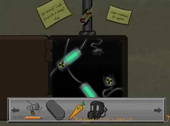 ![]() De puzzels zijn een samenraapsel van absurde problemen. Eigenlijk ben je alleen maar bezig met het zoeken naar een uitgang uit de bunker, waarbij je allerlei vreemde personen tegenkomt met vreemd gedrag. De puzzels zijn niet al te moeilijk, ook niet voor een beginnende speler en passen prima bij het verhaal, waar ook geen touw aan vast te knopen is. Met een beetje creatief denkwerk bij het oplossen van Otto's problemen, kom je al een heel eind. Deuren openen, brandkasten kraken of oude computers voor de gek houden vergt even denken buiten de gebaande paden. Naast de logische puzzels waarbij je voorwerpen gebruikt die je hier en daar vindt en een enkele dialoogpuzzel, zijn er ook kleine minigames en zelfs een parodie op een RPG gevecht. Voorwerpen die je opraapt worden bewaard in een overzichtelijke balk onderin je speelscherm en je spel opslaan wanneer je dat wilt, kan via Otto's smartphone. Heel prettig geregeld allemaal.