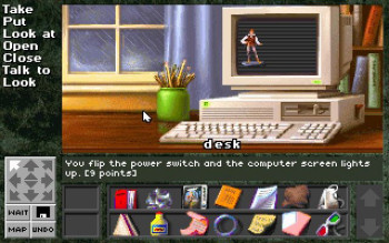 COMPANIONS OF XANTH![]() Uitgever: Legend Entertainment / 1993 Ontwerper: Legend Entertainment Platform: PC. Systeemeisen: --- MS-DOS 5.0 of hoger - Processor: Intel i386 - 640 KB RAM - SVGA videokaart - Soundblaster geluidskaart - Floppy- of CD-ROM drive. Categorie: Science fiction, fantasiewereld, magie, humor, 2D getekende beelden, 1ste persoon, point & click. Beschrijving: Dug is een jongeman die op een regenachtige dag een computerspel in zijn post vindt. Het spel tranporteert Dug naar de magische wereld Xanth, waar vreemde vogels mystieke liedjes fluiten en cactusnaalden dodelijk zijn. Nada Gaga, die soms mens, soms slang is, zal Dug vergezellen als hij op zoek gaat naar een prijs. Hij heeft competitie, want Kim, een meisje dat ook van de aarde komt, is eveneens op zoek naar die prijs. Dug gelooft niet zo in magie, maar zal zijn mening moeten bijstellen als zijn zoektocht hem in vreemde werelden brengt, waar hij nog vreemdere wezens ontmoet.
