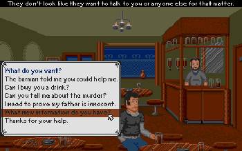 CRIME CITY![]() Uitgever: Impressions Games / 1992 Ontwerper: Interactive Fantastic Fiction Platform: PC. Systeemeisen: --- MS-DOS 3.01 - Processor: Intel 8088/8086 - 640 KB RAM - EGA, VEGA videokaart - Adlib geluidskaart, 3.5" floppy disk of CD-ROM drive. Categorie: Detective, moordmysterie, fictieve stad, 2D getekend beeld met tekst, 1ste persoon, point & click. Beschrijving: Je speelt de rol van Steven White, een arme kerel die detectiveverhalen schrijft maar niets liever wil dan een echte privédetective worden, net als zijn vader. Op een dag lukt het schrijven niet zo best. Maar dan staat een mysterieuze blondine voor zijn deur en vertelt hem dat zijn vader Henry White is gearresteerd voor moord! Het is aan jou om te bewijzen dat de politie ongelijk heeft, door op zoek te gaan naar de echte moordenaar en natuurlijk de bewijzen daarvoor te verzamelen. Het spel heeft een automatische inventaris. Als je een voorwerp in bezit hebt, wordt het automatisch gebruikt. Ook loopt er een klok mee, die er onder andere voor zorgt dat je moe wordt of honger hebt.