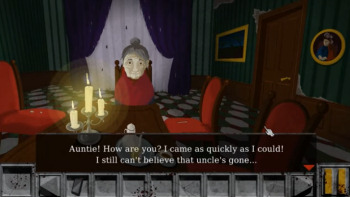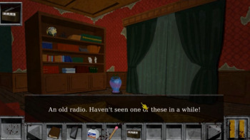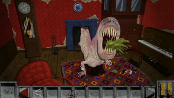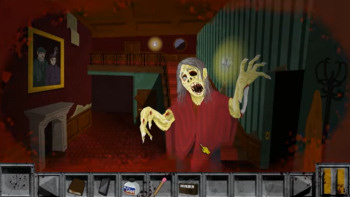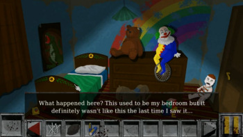 ![]() Er zijn ruim twintig locaties te bezoeken, handgetekend in een stijl die doet denken aan de spellen uit de negentiger jaren. De statische achtergronden zijn voldoende gedetailleerd met kleuren die aan de donkere kant zijn, iets wat natuurlijk goed past bij het horrorverhaal. Beweging in de achtergrond is er ook niet zo veel. Er is wel een rat en een kever die wat rondscharrelen en de typemachine beweegt zijn toetsen uit zichzelf. Geen stromend water, lichtflitsen, pruttelende pannen en dergelijke, maar die mis je ook niet. De dodende monsters en vooral de clown zijn in mooie heldere kleuren weergegeven, wat de levendigheid bevordert. Ze bewegen goed geanimeerd en snel over het scherm, in tegenstelling tot de andere monsters die in enkele plaatjes van positie veranderen en nauwelijks beweging weergeven. Het enige minpunt is het tekstvak dat onder aan het scherm bovenop de plaatjes staat, zodat je het hele plaatje minder goed ziet.