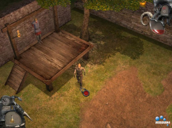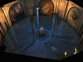 ![]() Het camerastandpunt in Daemonica is ongewoon voor een adventure, maar heel gewoon in een RPG. Je ziet Nicholas schuin van boven in vogelperspectief. Je kunt inzoomen en daarmee het camerastandpunt veranderen. De achtergronden zijn niet 2D statisch, met een 3D rondlopend karakter. Alles is in 3D. Nadeel daarvan is dan wel, dat de achtergronden niet zo rijk en schitterend zijn uitgevoerd als bijvoorbeeld in Syberia. De stemmen zijn goed. De muziek eveneens. Er zijn echter weinig achtergrondgeluiden om de sfeer aan te geven. Er is veel geschreven tekst die info geeft en de onderdelen aan elkaar praat. Het gebruikte lettertype is wat moeilijk te lezen.