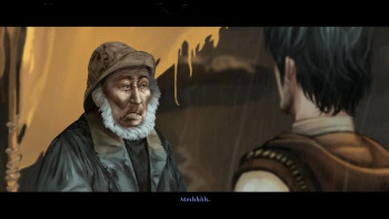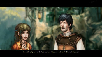 ![]() Geron en Nuri bezoeken op hun reis interessante plekken en dit gaf de ontwerpers van het spel alle kans zich uit te leven in fraaie handgetekende achtergronden, die inmiddels het huismerk zijn van Daedalic. Elke scene is aantrekkelijk fantasievol, gedetailleerd en sprankelend of die nu in een stad of bos, buiten of binnen, in het licht of het donker is. Met kleine animaties als wimpels die bewegen in de wind, motjes rond een brandende lamp, is alles ondergedompeld in een soort knusheid, die je bijvoorbeeld ook in de tekeningen van Anton Pieck ziet. In deze fantastische achtergronden valt wel op dat de bewegingen van de karakters in het spel minimaal en simpel zijn. Iedereen, behalve Geron, beweegt stijfjes en nauwelijks. Geron bukt, kijkt omhoog, pakt dingen op en beweegt zijn schouders als hij adem haalt. Maar als Geron druk bezig of in gesprek is, staat Nuri als bevroren alleen te ademen. In contrast daarmee zijn de close-ups, die levendige gezichtsuitdrukkingen met opgetrokken wenkbrauwen, opengesperde ogen en lipsynchronisatie laten zien bij elk karakter, maar nog steeds met onbeweeglijkheid beneden het hoofd. De zwartwitte stripbeelden met commentaar op de gebeurtenissen, die je tussen de hoofstukken te zien krijgt, zijn een duidelijke en goede overgang naar de volgende speelbare scenes.