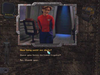 DARK SIDE OF THE MOON![]() Uitgever: SouthPeak / 1998 Ontwerper: SouthPeak Platform: PC. Systeemeisen: --- Windows 95/98 - Processor: Pentium 166 MHz - 32 MB RAM - Videokaart: 2 MB SVGA 16-bit display - 16-bit Windows compatible geluidskaart - 8x CD-ROM drive - 150 MB opslagruimte. Categorie: Science fiction, mysterie, maanbasis, getekend realisme en FMV, 1ste persoon, point & click. Beschrijving: In de intro zien we een man wegrennen van iets onbekends, maar absoluut buitenaards. Omdat er echter geen ontsnapping mogelijk was van het wezen, blies hij zichzelf op. Dan begnt het spel en lijkt het erop dat het je oom Jacob was. Jouw naam is Jake en blijkbaar heeft hij alles aan jou nagelaten. Hij was een van de belangrijkste eigenaren van ertsmijnen op Luna Crysta in een ander sterrenstelsel. Sommigen zeggen dat die mijnen waardeloos zijn en dat hij daarom zelfmoord pleegde. Jake gelooft niet in dat 'zelfmoord'-verhaal, dus neem hij een shuttle naar Luna Crysta om het mysterie op te lossen en de waarheid te achterhalen. Waarom werd oom Jacob vermoord en wat was er zo belangrijk aan wat hij vond/ontdekte en waarvoor hij werd vermoord?