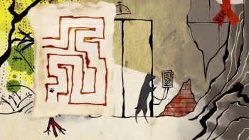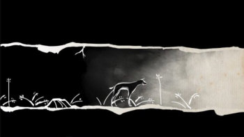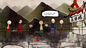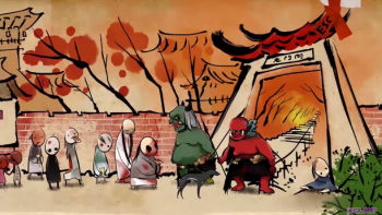 ![]() De prachtige achtergronden zijn handgetekend in vloeiende lijnen. Het lijkt alsof op een stuk rijstpapier, met inkt gekleurde vlakken later voorzien werden van zwarte lijnen. Kunstwerkjes, die niet slecht zouden staan, ingelijst aan je muur. Kleine animaties in achtergrond zoals een vogel of wiebelende hoofden en druppend bloed geven wat levendigheid. Ook de hond is schitterend minimalistisch weergegeven in vloeiende lijnen. En hij beweegt net zo vloeiend over het schem. De muziek is mede sfeerbepalend. Fluit- en drum zorgen voor een typisch Aziatisch geluid. Hetzelfde deuntje klinkt door het hele spel en dat kan soms wat storen, maar over het algemeen is het prettig spelen met muziek die bij de beelden past. Er zijn geen gesproken stemmen in het spel.