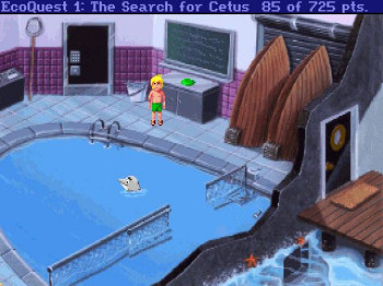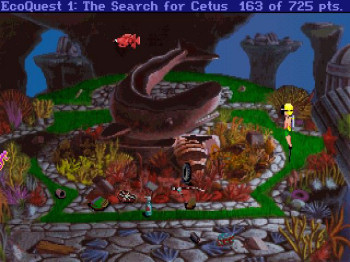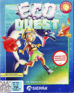 ECOQUEST: The Search for Cetus![]() Uitgever: Sierra On-Line / 1991 Ontwerper: Sierra On-Line Platform: PC. Systeemeisen: --- MS-DOS 5.0/Windows 3.0 - Processor: 386 SX of beter - 2 MB RAM - VGA videokaart - 4 MB opslagruimte - 2x CD-ROM drive - Adlib, Soundblaster geluidskaart. Categorie: Educatief, kinderen, onderwaterwereld, onderzoek, 2D en 2.5 D getekend realisme, 3de persoon, point & click. Beschrijving: Adam is het zoontje van een ecoloog en al een echte natuurbeschermer. Als zijn ouders verhuizen, zal Adam op zoek moeten gaan naar nieuwe vrienden. Hij ontmoet een pratende dolfijn en daarmee beginnen zijn avonturen. Adam en Delphinius de dolfijn helpen een onderwaterstad als daar problemen ontstaan met afvalresten en een grote vleeseter, precies zoals de profeten voorspeld hadden. Bovendien redden ze ook nog walviskoning Cetus, de verdediger van de stad.