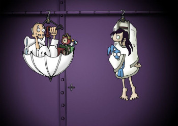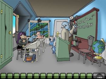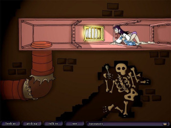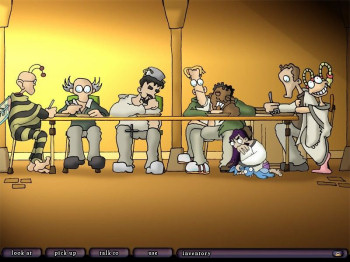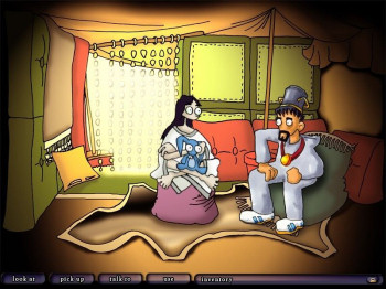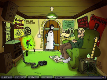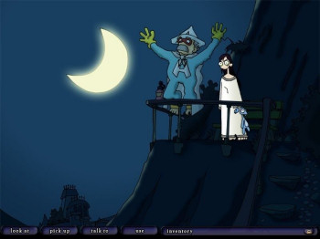 ![]() De kleurrijke en gedetailleerde achtergronden zijn in 2D, maar dat wil niet zeggen dat het daarom minder is dan een spel met realistisch aandoende 3D beelden die de laatste tijd zo in zijn. De geanimeerde karakters staan of zitten in meer dan honderd handgetekende achtergronden. Het is eigenlijk de meest ideale manier om absurde situaties weer te geven. Edna (en Harvey) is de enige die min of meer vrij rondloopt en dit geeft een speciale charme aan het spel. De tekeningen zien er misschien uit alsof ze door en voor kinderen gemaakt zijn, maar dat maakt het nog geen spel voor kinderen. Niet alleen omdat de puzzels te moeilijk zijn, maar met name het laatste hoofdstuk, waarin Edna probeert uit te vinden of haar vader een moordenaar is, is niet geschikt voor kinderen onder de twaalf jaar.