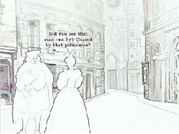 ![]() Het hele spel is point en click, maar op een bijzondere manier. In de standaard adventures raap je dingen op die je combineert en gebruikt. In dit spel manipuleer je de gedachtes van de hoofdpersoon, zodat hij zelf een oplossing vindt voor de problemen die hij ontmoet. Dit alles gebeurt met een simpel rechtsklikken op Valjean en aansluitend rechtsklikken op de persoon of het voorwerp waarop je zijn aandacht wil vestigen. Valjean zal dan nadenken over wat hij weet in relatie tot dat voorwerp of die persoon en al of niet een idee krijgen, dat hem verder helpt. Dubbelklik je op een persoon, dan krijg je achtergrondinformatie, zoals de naam en waar die persoon vandaan komt. Doordat je de gedachtes van de personages kunt lezen, krijg je ruim voldoende hints om te weten wat je moet doen. Maar mocht je toch vast komen te zitten, dan is er altijd de F1 toets. Hiermee ga je rechtstreeks naar de hemel, waar Victor Hugo zelf je precies zegt wat je moet doen om je probleem op te lossen. Als je het spel een poosje aan de kant gelegd hebt, kun je later heel gemakkelijk de draad weer oppakken. In de spelmap vind je het bestandje My Story, waarin je precies kunt nalezen wat je tot dan toe gedaan hebt.