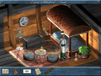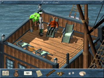 EYE OF THE KRAKEN![]() Uitgever: Absurdus / 2002 Ontwerper: Absurdus Platform: PC. Systeemeisen: --- Windows 95/98/2000/ME/XP - Processor: Pentium 350Mhz - 64Mb RAM - DirectX 8 en later - 200 MB opslagruimte. Extra info: Er zijn problemen vastgesteld met nieuwe NVidea drivers. Zet, om het probleem op te lossen, de hardware accelleratie lager. Categorie: Detective, literaire verdachten, humor, 2D en 2.5D isometrisch getekend beeld, 3de persoon, point & click. Walkthrough: klik hier voor Marjo's Nederlandstalige walkthrough. Beschrijving en review: Na een met opzet in streperig zwart/wit uitgevoerde intro, onderstreept met krakerige muziek, gaat het spel verder in kleur. Een dief heeft een voorwerp aan boord van het schip de Glutomax gebracht. Dit mysterieuze voorwerp, bekend als eye of the krakenzou kunnen worden gebruikt om een gigantische kraken (soort inkvis) op te roepen in een heidens ritueel. Gelukkig is Abdullah, de vertegenwoordiger van een Sultan, ook aan boord. Aan hem de eer om dit eye of the krakente vinden voordat het schip in de volgende haven aanlegt. Het spel volgt dagdelen, die je pas kunt bereiken als je een bepaalde actie hebt uitgevoerd. De beelden zijn kleurrijk getekend en zeer gedetailleerd. De karakters lopen vloeiend door het beeld. De puzzels zijn voornamelijk gebaseerd op je inventaris en niet al te moeilijk. Luisteren naar wat de personen te vertellen hebben, geeft je hints over wat te doen en hoe. Om sommige grappen te begrijpen is een beetje geschiedkundige literaire kennis nodig, zoals waar iemand zegt dat je moet oppassen met Grieken die je geschenken geven (Paard van Troje). ![]() ![]() Meteen spelen? Download dit gratis spel, op de officiële site. Grotere plaatjes bekijken? Ga naar de screenshots. |