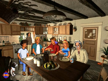 THE FAMOUS FIVE 1: Treasure Island![]() Uitgever: Ravensburger Interactive / 1999 Ontwerper: Enid Blyton, Westka Production Platform: PC. Systeemeisen: --- Windows 95 - Processor: Intel Pentium - 16 MB RAM - Videokaart met 800x600 resolutie - 8x CD-ROM drive. Categorie: Detective, professor, gezonken schip, 2D stripkarakters in getekende realistische achtergrond, naar boek Enid Blyton, 3de persoon, point & click. Beschrijving: Treasure Island is een interactief avontuur geïnspireerd op de populaire Famous Five Books van Enid Blyton. De broers Julian en Dick en hun zus Ann logeren bij hun neef George (Georgina eigenlijk) en haar trouwe hond Timmy, en George's ouders, oom Quentin en tante Fanny, in Kirrin Cottage. Ze zijn echter niet de enigen: een mysterieuze, sluwe professor heeft een van de kamers in het huisje gehuurd. De kinderen worden al snel achterdochtig jegens de professor, wanneer ze ontdekken dat hij geïnteresseerd is in een oud scheepswrak dat vele jaren eerder voor het eiland Kirrin was gezonken. De Famous Five beleven een spannend avontuur met grotten, geheime schuilplaatsen, roeiboten, kasteelruïnes, kerkers en verborgen schatten.