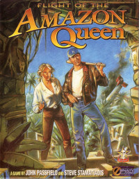 FLIGHT OF THE AMAZON QUEEN![]() Uitgever: Renegade Software / 1995 Ontwerper: Int. Binary Illusions Platform: PC, Android, iPad. Systeemeisen: --- DOS 4.0 of hoger - 386 processor - 4 MB RAM - 3.5" floppy disk, CD-ROM drive - Videokaart: VGA display - Geluidskaart: Adlib, Roland MT-32, Sound Blaster. --- Windows met ScummVM. Extra info: Het DOS-spel werd in 2004 als freeware (gratis spel) vrijgegeven, voor gebruik met ScummVM + Windows. In 2016 werd ter gelegenheid van zijn 20ste verjaardag met bonusmateriaal heruitgegeven voor PC, Android en iPad. Categorie: Humoristisch avontuurlijk, Amazone gebied, wereld redden, 2D en 2.5D getekend realisme, 3de persoon, point & click. Walkthrough: klik hier voor Marjo's Nederlandstalige walkthrough. Beschrijving en review: Joe King, piloot van beroep, wordt door een filmster ingehuurd om haar naar de Amazone jungle te brengen voor een fotosessie. Zijn aartsrivaal Hans Anderson heeft echter zo zijn eigen plannen en sluit Joe op in een hotelkamer. Je eerste taak is dan ook om te ontsnappen. Maar ben je dan eindelijk op weg, zijn de problemen nog niet voorbij. Het vliegtuig crashed in de jungle en Joe rolt van het ene avontuur in het andere. Amazone prinsessen bevrijden en snuffelen in de duistere zaakjes van een vreemde organisatie hoort allemaal bij het leven van een echte avonturier. Evenals het redden van de wereld! Er is veel te doen in dit spel. De puzzels zijn meestal gebaseerd op je inventaris, maar ook de juiste vragen stellen aan de karakters die Joe ontmoet, is van belang. De stemmen zijn ingesproken door professionele acteurs (Penelope Keith, Bill Hootkins), wat het spel zeer zeker ten goede komt. De beelden zijn kleurrijk, afwisselend en zeer gedetailleerd getekend. De bediening is klassiek aanwijzen en klikken, waarbij je tekst krijgt die aangeeft wat je ziet en het spel laat je alle vrijheid op eigen houtje rond te neuzen.