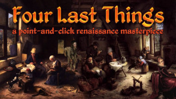 FOUR LAST THINGS![]() Uitgever: Joe Richardson / 2017 Ontwerper: Joe Richardson Platform: PC, Mac, Linux, Android, iOs. Systeemeisen: --- Windows Vista/7/8 - Processor: 2 GHz, Dual Core - 2 GB RAM - Grafische kaart: OpenGL 2.0 compatible met 512 MB RAM - DirectX 9.0c - 500 MB HD ruimte - DirectX 9.0c compatible geluidskaart met de laatste drivers. Categorie: Historisch, humoristische levensloop, Renaissance schilderijen, 3de persoon, point & click. Walkthrough: klik hier voor Yvonnes Nederlandstalige Walkthrough. Beschrijving: Indie developer Joe Richardson heeft een point and click adventure gemaakt in een cultureel-historische omgeving: de tekeningen zijn gemaakt van schilderijen uit de renaissance en de achtergrondmuziek is klassieke muziek die goed past bij de schilderijen en het verhaal. Het verhaal begint met Adam en Eva bij de boom van goed en kwaad en volgt dan de hoofdpersoon, die helaas geen naam heeft, maar met "you" wordt aangeduid. Deze man die eruit ziet alsof hij uit een Renaissance schilderij is weggelopen, wil vergeving voor alle zonden die hij in zijn leven begaan heeft. De kerk kan hem alleen vergeven voor de zonden die hij in de parochie van die kerk heeft begaan, dus moet hij alle zonden nogmaals doen in déze parochie. De "four last things" uit de titel slaan op dood, oordeel, hemel en hel, de laatste vier stadia van de ziel in het leven en het hiernamaals. Dat stuk van het spel zie je dus uiteraard aan het einde en speelt zich af in een Jeroen Bosch schilderij.