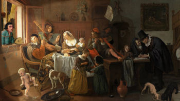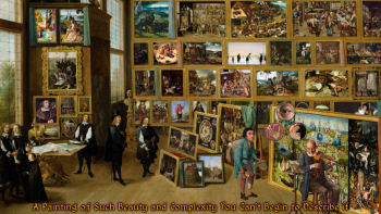 ![]() De plaatjes zijn fantastisch. Veel schilderijen van Jeroen Bosch, Bruegel en andere Vlaamse grootheden zie je in het spel als achtergrond van de pelgrim You. Ook is er een galerie waar onnoemlijk veel schilderijen geëxposeerd worden, die je allemaal al inzoomend kunt bekijken. In de schilderijen, die in het spel gebruikt worden, bewegen de personen: ze lopen, dansen of spelen op een passende, bij het schilderij horende manier en zijn gekleed op de manier die je op de schilderijen ook ziet. Aan de mimiek op de gezichten is dan óók aandacht gegeven. Richardson voegt aan het eind van het spel een lijstje toe van werken die hij gebruikt heeft.