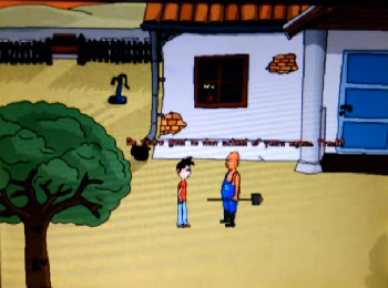 FRANK THE FARMHAND![]() Uitgever: Mattias Jeppson / 2004 Ontwerper: Mattias Jeppson Platform: PC. Systeemeisen: --- Windows - Processor: Pentium 300 MHz - 32 MB RAM - Videokaart 16 MB VGA Categorie: Fantasie, samenzwering, zoektocht, 2D en 2.5D getekende beelden, 3de persoon, point & click Walkthrough: klik hier voor Marjo's Nederlandstalige walkthrough voor deel 1. klik hier voor Marjo's Nederlandstalige walkthrough voor deel 2. Beschrijving en review: Deel 1: The Big Escape Ergens in Texas, in een verder verlaten landschap, staat een boerderij. Frank praat met zijn vader, die het maar onzin vind dat Frank naar school gaat. Hij vindt de boerderij belangrijker, maar Frank wil liever naar school en iemand worden, de boerderij is saaaaaaaaiii. Vader vindt het best dat hij op school gaat spelen, als hij maar op tijd terug is voor het werk. Frank stapt in zijn auto en rijdt naar een kustplaatsje, naar zijn school. Hier ontdekt hij dat professor Conrad verdwenen is. De mannen van de FBI, die de zaak onderzoeken, gedragen zich zeer vreemd. Ze praten over het vermoorden van de professor! Frank besluit de professor te gaan zoeken en redden. En dan raakt hij verzeild in een samenzwering tegen de president, de klu-klux-clan en belandt hij uiteindelijk aan het andere einde van de wereld. Deel 2: The Secret of Guija In dit langere vervolg op deel 1, vindt Frank een brief die aantoont dat het niet de president is, die het land bestuurt! Frank en zijn vrienden worden gevangen genomen door het leger en op een eiland in een gevangenis gegooid. Zorg dat Frank ontsnapt en ook zijn vrienden helpt. Het non-lineaire verhaal is goed doordacht met verrassende plotwendingen. Je hebt een grote vrijheid om de acties in je eigen volgorde uit te voeren. Op sommige punten is het wel een beetje 'pixelhunting', zoeken naar de kleine plek waar je cursor actief wordt. Het verhaal en de tekeningen blijven origineel.