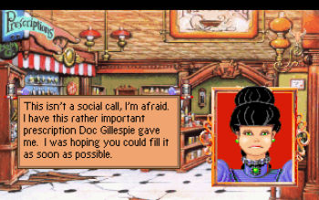 FREDDY PHARKAS, Frontier Pharmacist![]() Uitgever: Sierra On-Line / 1993 Ontwerper: Al Lowe, Josh Mandel, Sierra On-Line Platform: PC, Mac. Systeemeisen: --- MS-DOS 4.0 of hoger - Processor: Intel i386 - 640 KB RAM - 3.5" floppy disk of CD-ROM drive - EGA, MCGA, VGA videokaart - Sound Blaster en compatible geluidskaart. Categorie: Western, humor, complot, recepten maken, getekende 2D en 2.5D beelden, 3de persoon, point & click. Beschrijving: Freddy Pharkas was een van de snelste schutters in het Amerikaanse westen van de jaren 1880. Echter, in een vuurgevecht met een outlaw genaamd Kenny, werd zijn oor eraf geschoten. Deze traumatische ervaring zorgde ervoor dat Freddy zijn pistolen opgaf en zich inschreef voor de school voor farmacologie. Freddy blokkeert alle herinneringen aan zijn verleden en gaat naar de stad Coarsegold met de droom om zijn eigen apotheek te bezitten en te runnen. In samenwerking met de stadsdokter kan Freddy recepten schrijven, brouwsels mengen en eenvoudige symptomen diagnosticeren. De zaken onder de stedelingen zijn eerst zeer levendig en winstgevend. Maar deze goede tijden zullen niet lang duren, omdat de inwoners plotseling uit de stad vertrekken en bedrijven worden dichtgetimmerd. Het landelijke stadje ondergaat de ene catastrofe na de andere: brandstichting, stormloop, huurmoordenaars, rivierbootgokkers... zelfs terminale winderigheid! Freddy moet de problemen van de stad oplossen of het risico lopen een chique winkel te hebben in een lege stad en al zijn klanten te verliezen.