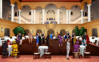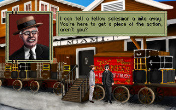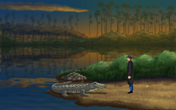 ![]() Niet alleen speelt het verhaal zich af in het verleden, maar ook grafisch ziet het spel eruit alsof het in de vorige eeuw is gemaakt. De achtergronden zijn zeer gedetailleerd, maar soms zijn kleine voorwerpen dan in te weinig pixels. Het hoort erbij. Ook de kleurstelling is goed gekozen. Vrolijke kleuren in de buitenlucht van een zonnig Miami, een gouden glans in een balzaal of duur kantoorpand en gedekte tinten 's nachts in de steegjes en moeras. De achtergrondanimaties zijn spaarzaam, maar aanwezig. Die van personen zijn eenvoudig en verlopen soepel. Alleen in de dialogen is alles statisch, inclusief de pop-up gezichten van de sprekers. Eigenlijk allemaal precies zo als je het verwacht in een retrospel.