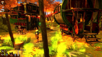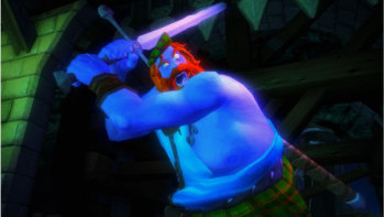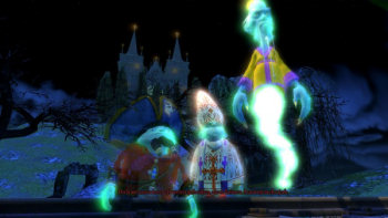 ![]() De 3D grafische achtergrondbeelden zijn mooi en gedetailleerd. In die enkele scène overdag zien de planten er nogal plat uit, maar omdat het spel zich eigenlijk helemaal in het donker of bij kunstlicht afspeelt, kun je verder volop genieten van een "griezelig" kerkhof of een bouwvallig theater. De perfecte omgeving ook voor de geesten, die hun eigen charme hebben, uitstekend passend bij de sfeer van het humoristische spookverhaal. De spoken zijn stereotypen op een cartoneske manier. Een kleine pittige piraat, een grote stoere Schotse held, allemaal omgeven door een soort groen-fluoriscerend licht. En alles beweegt soepel en vlotjes. Erg leuk om naar te kijken.