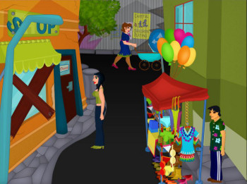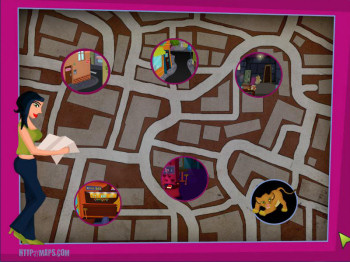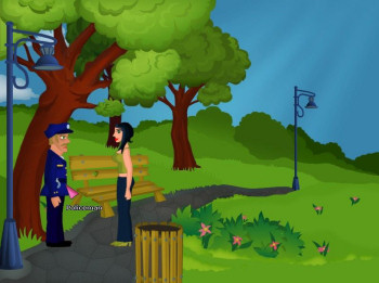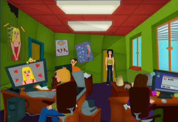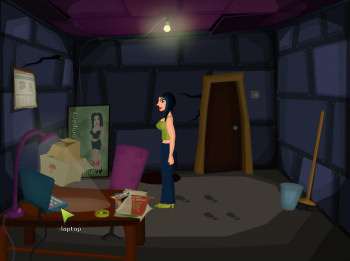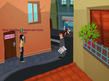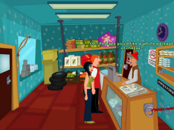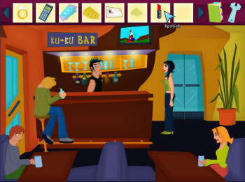 ![]() De handgetekende achtergronden zijn in een herkenbare stijl, met vrolijke kleuren. Voorwerpen zijn niet overdadig gedetailleerd, maar er is ruim voldoende aandacht besteedt aan de aankleding van een locatie. Veel voorwerpen zijn dan ook alleen aanklikbaar voor het commentaar en niet persé nodig om Helga's problemen op te lossen. Soms zijn er in de achtergrond animaties, zoals in de straat waar de winkel en het kantoor liggen. Hier zie je - en niet steeds dezelfde! - mensen langswandelen. Het geheel geeft een evenwichtige, aantrekkelijke en prettige speelomgeving. Helga loopt zelf nogal eigenaardig steeds vanaf de zijkant gezien, maar dat is de spelmakers makkelijk vergeven. Een leuk klein detail is de 'wacht even' cursor: een muis die in een molentje rondrent.