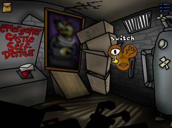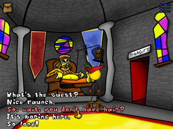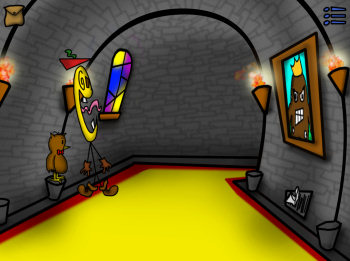 ![]() Er zijn geen gesproken dialogen in het spel. Gelukkig maar, zou ik bijna zeggen, want zo kun je volop genieten van de uitstekende, aanstekelijke jazzy muziek en zelf in je hoofd bepalen hoe de de maffe karakters klinken. En ze hebben allemaal heel veel te vertellen. Niet alleen het commentaar dat je krijgt als Sir Jimothy ergens naar kijkt of tegen praat, maar ook de uitgebreide dialoogkeuzes als hij in gesprek is met iemand. Grafisch ziet alles er prima uit. Er zijn meer dan tachtig verschillende achtergronden in quasi eenvoudige (kromme) lijnen en vrolijke kleuren die meteen de sfeer bepalen. Zelfs de grijze muren in het kasteel worden opgeleukt met portretschilderijen en glas-in-lood ramen. Het is allemaal goed gedetailleerd, waar het nodig is. De animaties van pratende karakters zijn, zeker in combinatie met de teksten, grappig en heel goed gedaan. Ze trekken gekke bekken en ontploffen net als in cartoons. Het plezier dat de spelmakers hebben gehad bij het maken van dit maffe avontuur, spat ervan af.