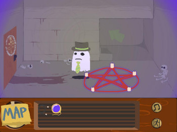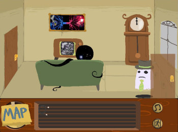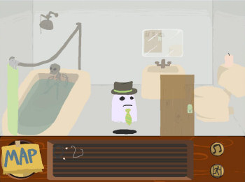 ![]() De achtergronden zijn handgetekend in een aantrekkelijke minimalistische stijl. Hier en daar zijn leuke details, zoals een pot met een brein, die kapotgevallen is. Of een poster van "gamesover" in de slaapkamer van een hele vreemde zombiemeid. Jack is niet meer dan een laken met een hoed op en dat pas wel bij hem. Hij wiebelt/zweeft een beetje ongeduldig boven de grond, wachtend tot de speler hem ergens anders heenstuurt. De zogenaamde 'horror' elementen zijn niet echt vies of eng. Ze beenderen en het bloed worden met een knipoog bekeken. Er zijn in huis ruim voldoende kamers en kasten die je kunt doorzoeken, zonder akelige schrikeffecten. Je kunt zelfs in de voortuin en in de achtertuin het een en ander doorzoeken en doen. En tegen het verdwalen kun je altijd een plattegrond oproepen.
