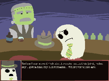 JACK HAUNT: Old Haunting Grounds![]() Uitgever: Evolving Poet Media / 2013 Ontwerper: Evolving Poet Media Platform: PC, Mac, Linux. Systeemeisen: --- ? Categorie: Humoristische horror, spoken, handgetekende 2D beelden, 3de persoon, point & click. Walkthrough: klik hier voor Marjo's Nederlandstalige walkthrough. Beschrijving en review: Jack Haunt is een pulp mystery adventure spel. Je speelt als een dode detective, die bij een spelletje kaart het spookrecht op zijn huis verspeelt. Nu heeft hij nog twee dagen de tijd om zijn resten bij elkaar te verzamelen en te vertrekken. Het eerste probleem waar Jack tegenaan loopt, is natuurlijk het feit dat hij als spook niets kan oprapen. Is dat probleem uit de weg, dan kan hij op zoek naar zijn stoffelijke resten. Botten genoeg in het huis, maar die zijn allemaal niet van hem. Naast het oplossen van Jack's problemen, zijn er in het spel ook nog 'sidequests', zoals het weer levend maken van en dode hond. Niet nodig, maar natuurlijk wel leuk om te doen. Zeker omdat het spel op zich al niet zo groot is. In een uurtje of twee speel je er wel doorheen.